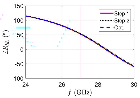 The design parameters of the PCM are here optimized to have an RHCP broadside pencil beam at 27 GHz with low cross-polarization levels. Thanks to the aforementioned decoupling between the top and bottom layers of the PCM, the modifications introduced in the optimization of the top layer have very little impact on the reflection coefficient and hence on the cavity height. This concept is corroborated in Figure 2, where the reflection-coefficient phase is reported for different optimization steps showing a quasi-perfect superposition. The complete list of optimized unit-cell parameters is reported in Table 1, (see Figure 1 for the definition of the symbols).