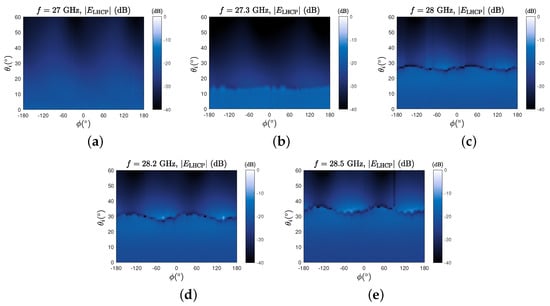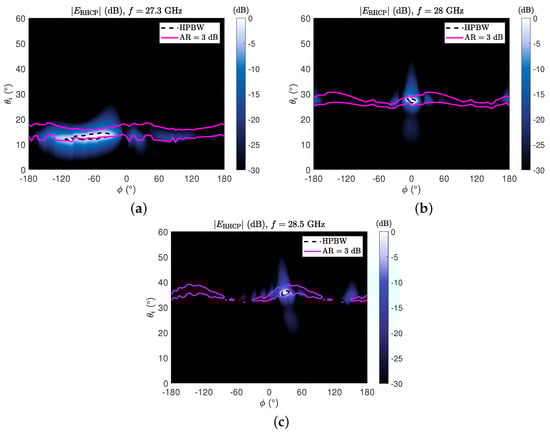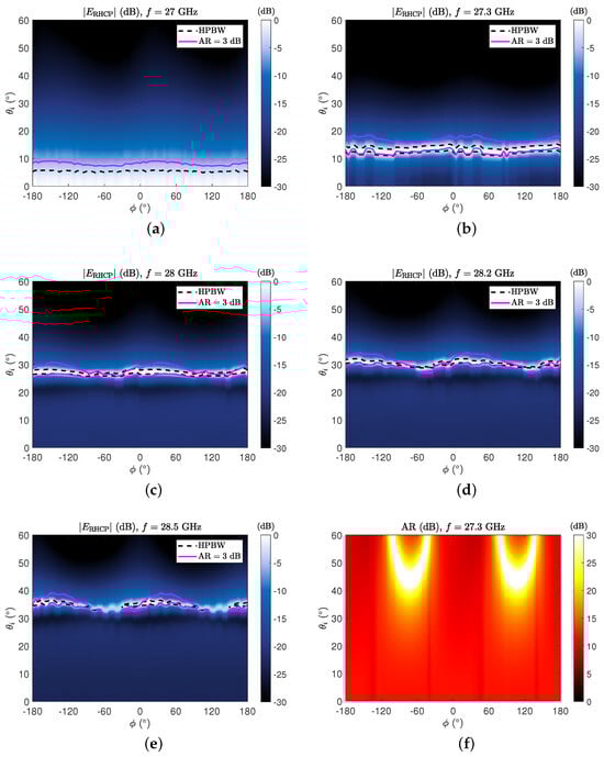 At this stage, one can evaluate the far-field components and over different directions and, thus, obtain the corresponding and quantities through (2). The desired co-polar, far-field pattern of the component is reported in Figure 3a–e for different frequencies in the overall 27–28.5 GHz range. As expected, in Figure 3a, a broadside pencil beam is observed at 27 GHz. The −3 dB gain and 3 dB AR isolines are reported with a dashed black line and solid magenta line, respectively. It is manifest that the design process effectively led to a CP narrow beam at broadside for 27 GHz.