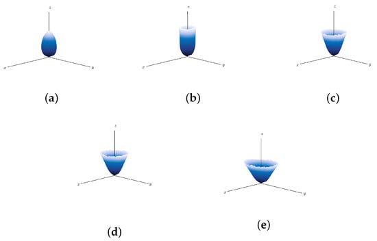 Pictorial representation of the co-polar, far-field component , in a 3-D format. From the broadside pencil beam starting condition in (a), by stepping up the operation frequency, the radiation pattern evolves to azimuthally invariant, conical patterns (b–e).