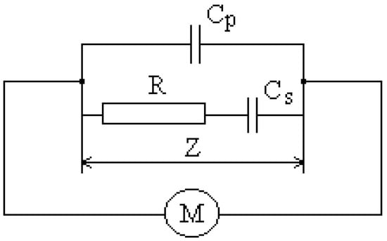 RCC equivalent model for measuring of electrical properties of food products (Z—impedance; R—resistance; Cs—series equivalent capacitance; Cp—parallel equivalent capacitance; M—measuring device) [55].