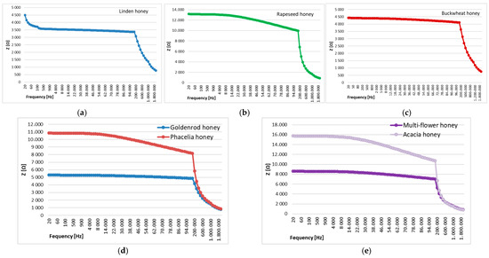 Impedance changes as a function of the measurement current frequency (from 20 Hz to 2 MHz) for honey: (a) linden; (b) rapeseed; (c) buckwheat; (d) goldenrod and phacelia; (e) acacia and multi-flower.