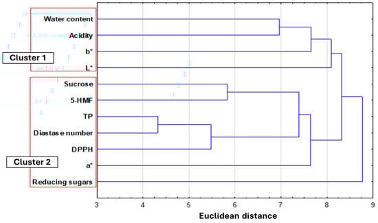 The first stage of analysis involved grouping the studied parameters using Ward’s agglomerative method. This method was used to ensure a system with minimal differentiation of parameters within clusters [59]. Grouping was performed for standardized data in order to increase data comparability (eliminating distortions of further statistical analyses resulting from differences in scale) and to increase the accuracy of calculations. Two clusters of parameters were distinguished (cluster 1 and 2) within the physicochemical parameters studied (qualitative and health-promoting). These actions were taken to reduce the number of variables in the next stage.