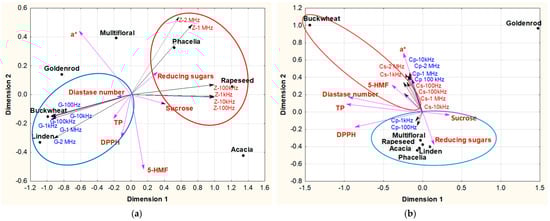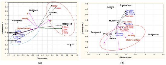 The second group of single-flowered honeys identified was as follows: the linden, buckwheat, and goldenrod honeys, which were characterized by the lowest resistance values (Z) and the highest conductivity values (G). Their average Z100Hz values were 3.71 × 103 Ω, 4.41 × 103 Ω, and 5.30 × 103 Ω, respectively. Good electrical conductivity of these honeys is indicated by the high G100Hz values, which were 3.23 × 10−4 S, 2.64 × 10−4 S, and 2.01 × 10−4 S, respectively (Table 4). According to Chudzińska and Baralkiewicz [74], the high electrical conductivity of buckwheat and goldenrod honeys may result from their high content of minerals, such as iron and magnesium, and organic acids (which also affects their dielectric properties). According to the research of Łuczycka and Tomaszewska [75], linden and phacelia honeys, due to the presence of essential oils and medium mineral content, are characterized by moderate conductivity.