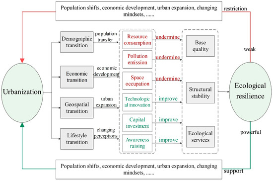 31]; therefore, mechanism analysis is the biggest contribution of this paper. However, this paper emphasizes the impact of urbanization on ecological resilience in the process of mechanism analysis, and the constraining and supporting role of ecological resilience on urbanization is less mentioned. The interactive coupling between urbanization and ecological resilience is not limited to the roles between the two systems internally; it may also be affected by the external roles of the system, such as global climate change and government policy interventions, which may be explicit or implicit, proximal or long-distance [