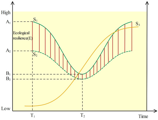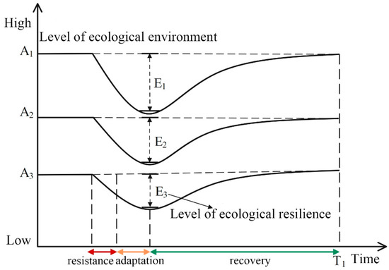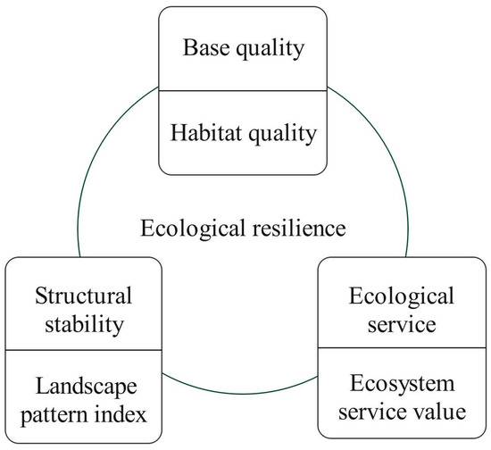 11]. This is consistent with the macroecological paradigm of studying the spatial and temporal distribution of ecosystems, dynamic evolution, and analysis of multiscale ecological processes and their drivers. Ecological resilience, as an important dimension of urban resilience research, is an important means of maintaining the balance and stability of urban ecosystems and dissipating uncertainty pressures and risks, and has become a popular topic of research [