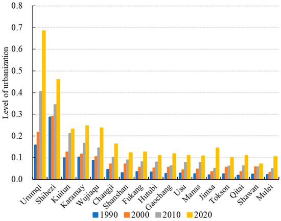 Figure 6). The growth rates of the urbanization level are 37%, 45%, and 53%, respectively, in the years 1990–2000, 2000–2010, and 2010–2020, and the growth rate of the urbanization level is increasing. From 1990 to 2020, the urbanization level growth of each county and city in the urban agglomeration varied greatly; Urumqi had the most significant growth, 0.5269, followed by Shihezi, with a growth of 0.1732, and Sha Wan, with the smallest growth of 0.0473.