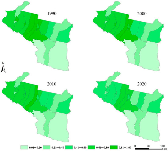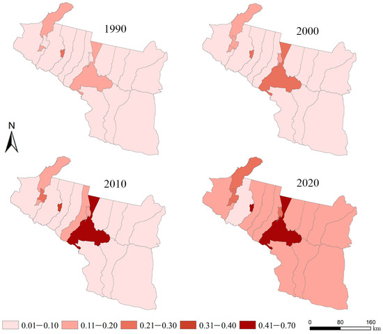 In 1990, 2000, 2010, and 2020, the urbanization levels of counties and cities in the UANST ranged from 0.0186 to 0.6851, and the urbanization levels were classified into five types: low level (0.00–0.10), lower level (0.10–0.20), medium level (0.20–0.30), higher level (0.30–0.40), and high level (0.40–0.70). ArcGIS10.6 was used to produce thematic maps (
