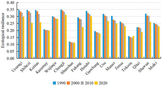 Figure 8). The overall trend for the ecological resilience of the UANST indicated a decrease. According to the magnitude of changes in ecological resilience from 1990 to 2020, the counties and cities on the UANST can be divided into four types: uplifted (uplifted by more than 0%), small decline (declining between 0% and 10%), medium decline (declining between 10% and 20%), and large decline (declining by more than 20%), with the number of uplifted counties and cities accounting for 5.88% of the total, only Tokson. The number of counties and cities with a small decline accounted for 29.41%, including five counties and cities in Karamay, Shanshan, Wujiaqu, Gaochang, and Mulei. The number of counties and cities exhibiting a medium decline accounted for 47.06%, including Hutubi, Changji, Jimusar, Urumqi, Qitai, Usu, Manas, and Shawan; the number of counties and cities exhibiting a large decline accounted for 17.65%, including eight cities; the number of counties and cities exhibiting a large decline accounts for 17.65%, including Fukang, Kuitun, and Shihezi. The counties and cities with larger decreases have higher urbanization levels, such as Shihezi, Kuitun, and Urumqi, indicating that the ecological resilience of the urban agglomeration decreases with an increase in the urbanization level. Although the urbanization process of the UANST has created positive feedback regarding the ecological resilience of counties and cities through environmental protection and ecological governance, the overall ecological resilience level of the urban agglomeration is still showing a weak downward trend.