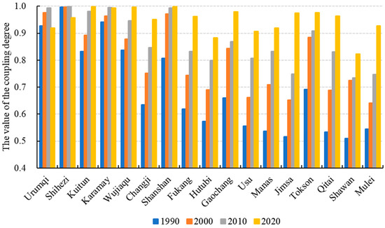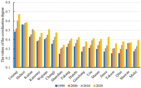 Figure 11). There are significant differences in the growth rates of different counties and cities from 1990 to 2020; the counties and cities that have obvious growth include Jimusar, Qitai, and Urumqi, with growth rates of 58.23%, 49.15%, and 38.77%, respectively. Counties and cities that have relatively small changes include Shihezi and Kuitun, with increases of 4.15% and 14.98%, respectively. The county with the highest degree of coordination between the urbanization system and the ecological resilience system of the urban agglomeration in 1990 was Shihezi, with a degree of coordination of 0.561; the county with the lowest degree of coordination between the urbanization system and the ecological resilience system was Shanshan, with a degree of coordination of only 0.245. By 2020, the highest degree of coordination between the urbanization system and the ecological resilience system of the urban agglomeration was Urumqi, with a degree of coordination of 0.672, followed by Shihezi, with a degree of coordination of 0.584; the county and city with the lowest degree of coordination between the urbanization system and the ecological resilience system is still Shanshan, with a degree of coordination of 0.342.