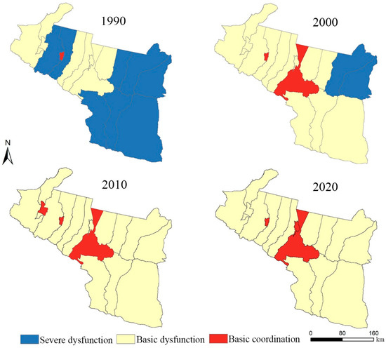 Figure 12). The central counties and cities have improved significantly, but the counties and cities at the east and west ends have improved slowly. In 1990, only Shihezi city in the urban agglomeration had basic coordination, and the rest of the counties and cities exhibited basic dysfunction and severe dysfunction; in 2000, the coordination of Urumqi increased significantly, and it had basic coordination along with Shihezi, and the counties and cities with severe dysfunctionality were reduced significantly. Only Jimusar and Mulei were classified as having severe dysfunction. In 2010, 17 counties and cities were classified as having severe dysfunction, dominated by basic dysfunction, and Kuitun grew from basic dysfunction to basic coordination. In 2020, the spatial distribution characteristics of the coupled coordination type were basically the same as those in 2010. Wujiaqu grew from basic dysfunction to basic coordination, and Kuitun was degraded from basic coordination to basic dysfunction. The results show that the coordination level of urbanization and ecological resilience in the UANST shows a trend of gradual improvement. However, most counties and cities still exhibit basic dysfunction, and the research results generally align with the coupled and coordinated changes in urbanization and ecological resilience in other arid region cases [