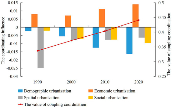 Figure 13), and when the coordinating influence is positive, it indicates that the urbanization subsystems have a promoting role in the coupling degree of coordination, and vice versa, it has a blocking role. The results show that economic urbanization plays a promoting role in the study period, and demographic, spatial, and social urbanization play a blocking role in the coupling coordination degree. The UANST is located in the oasis at the northern foothills of Tianshan Mountain, which is affected by the special natural conditions of limited water and soil resources in the arid area. Furthermore, the carrying capacity of the oasis for the population and space of counties and cities is limited, and social development is restricted; therefore, most counties and cities have a low level of population and spatial and social urbanization, and the improvement in the degree of coordination of the coupling is hindered. In the early period, the level of economic development of the UANST was poor, the level of industrial structure was low, the investment in ecological and environmental protection introduced by economic development was limited, and the promotion of economic urbanization in the coupling coordination degree was limited; after 2000, the economic development of the UANST entered an accelerated period, the industrial structure was adjusted and upgraded, and the financial investment was increased continuously. The promotion of economic urbanization in the coupling coordination degree was significantly enhanced.