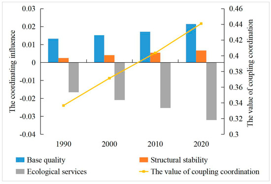 Figure 14), which indicates that the ecological resilience subsystems play a promoting role in the degree of coupling coordination when the coordinating influence is positive and vice versa for the blocking role. During the study period, base quality played a promoting role, structural stability played a promoting role, but with less intensity, and ecological services played a blocking role. From 1990 to 2020, the promoting roles of base quality and structural stability remained stable, and the blocking role of ecological services gradually strengthened, which indicates that the change in the degree of coupling coordination of the urban agglomeration mainly depends on the direction and intensity of the base quality and ecological services.