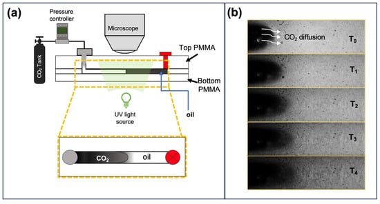 To implement an accurate quantification of time-dependent oil swelling by SDS and CO2 gas, we prepared a microfluidic platform consisting of a PMMA channel (1.5 mm (W) × 5 cm (L) × 1 mm (H)), inlet and outlet ports connected to the injection solutions and a Petri dish, respectively. The thickness of the microchannel was chosen to be 1000 μm to guarantee one-dimensional (1D) diffusion of CO2 gas into oil. It should be noted that PMMA has excellent transmission of visible light (>92%), suitable for direct optical microscopy. PMMA sheets were cut using a laser cutter (Universal Laser Systems, Inc., VLS 2.30, Scottsdale, AZ, USA) with a unique AutoCAD design. As shown in Figure 1, the PMMA sheet containing the microchannel was stacked with two other PMMA sheets, top and bottom. The top sheet was cut to create two holes for the inlet and outlet ports, while the bottom sheet was kept plain. These three sheets were thermally bonded in a sandwich-style arrangement to create a trapped microchannel in the middle. For thermal bonding, a solution with a 7:3 ratio of isopropyl alcohol (IPA) and ethanol was used between the sheets, and then the PMMA assembly was placed in the oven for 30 min at 50 °C. The 50 °C was used to keep the channel’s shape intact []. A special nano port fitting (IDEX Health & Science, N-333, Manhattan, NY, USA) was clamped with two additional PMMA sheets (3.175 mm thick) and four screws to ensure effective injection of CO2 without leakage. Approximately 90 μL of oil was injected into the microchannel using the syringe pump, and the inlet was carefully closed. A pressure controller was used to maintain the CO2 gas at a constant pressure on the other end of the channel. The microchannel was placed under the UV light source (Figure 1). Crude oil naturally exhibits autofluorescence due to the presence of polycyclic aromatic hydrocarbon (PAH) compounds under UV light, which changes its emission intensity because of its swelling upon CO2 dissolution [,]. Figure 1b shows an example of experimental images of oil’s emission change in the microchannel over time under constant CO2 pressure.