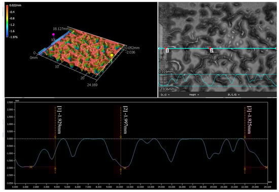 For flooding experiments, we employed a ‘reservoir-on-a-chip’ approach in micromodels. PMMA-based micro reservoirs containing random pore structures were engraved over the 50 mm × 25 mm engraved area with a laser cutter. The porous network was generated by MATLAB random network generation code and modeled in AutoCAD 2022. The engraved surface was analyzed by a 3-D profilometer (Keyence, VR-6100, Itasca, IL, USA), as shown in Figure 2. The analyzed images show that the average pore depth of the micro reservoir is 1 mm, with minimum and maximum depths of 0.25 mm and 1.997 mm, respectively. The pore volume of the entire reservoir was estimated to be 200 μL.