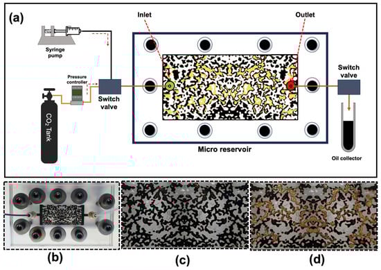 (a) Illustrative experimental set up for flooding experiment in a micromodel. (b) Actual image of the micro reservoir chip. (c) Optical microscopy image of the reservoir filled with oil. (d) Optical microscopy image of the reservoir after SDS-DI water flooding.