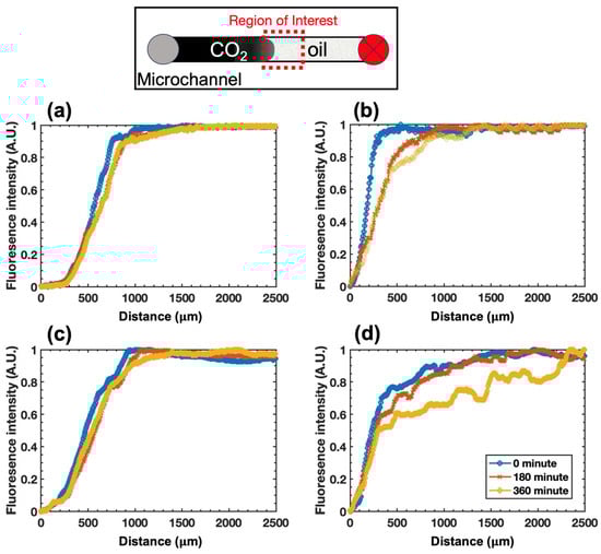 Figure 4 presents the changes in normalized fluorescence intensity along a microchannel filled with pure crude oil and 2% (w/v) SDS mixed oil at CO2 pressures of 5 and 10 psig. Each plot includes data collected at 0, 180, and 360 min after oil was pressurized under identical flow conditions. Initially, the fluorescence intensity is zero, indicating no oil presence at that point. The abrupt intensity changes depict the CO2 –oil interface, which was consistently positioned at the start of CO2 injection. As CO2 diffuses into the oil, the fluorescence intensity decreases from the interface along the channel over time (0, 180, 360 min) due to oil swelling. Figure 4a,b show the change in normalized oil intensity in pure oil and SDS mixed oil at 5 psig CO2 pressure, respectively. It shows that the rate change in intensity is comparatively prominent in SDS mixed oil over time (from 0 min to 180 min and to 360 min). Similarly, the rate change in intensity is more significant at 10 psig CO2 pressure upon SDS addition. Figure 4d represents the highest intensity change or, indirectly, the highest CO2 dissolution in oil among all cases. Overall, the SDS-mixed oil shows higher intensity transitions compared to pure oil, indicating better CO2 diffusion.