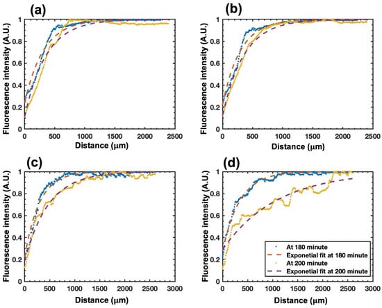 Fluorescent intensity profiles for pure oil and SDS-mixed oil at 180 and 360 min, along with their exponential fits. (a) Pure oil at 5 psig CO2 pressure. (b) 2% (w/v) SDS mixed oil at 5 psig CO2 pressure. (c) Pure oil at 10 psig CO2 pressure. (d) 2% (w/v) SDS mixed oil at 10 psig CO2 pressure.