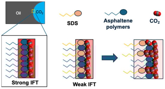 The increase in the rate of SDS-induced CO2 dissolution into oil is largely attributed to the amphiphilic property of SDS. An amphiphilic molecule such as SDS has both a hydrophobic tail and a hydrophilic head, allowing it to interact with both oil and CO2 []. Upon SDS addition into the system containing oil and CO2, it reduces the surface tension between them, which makes CO2 dissolution easier in oil. By adsorbing at the CO2–oil interface, the SDS molecules lower interfacial tension (IFT), reducing the energy barrier for CO2 transport across the interface (Figure 6). This lowered IFT enhances the mass transfer efficiency of CO2 into the oil phase, enabling finer dispersion of CO2 and increasing the contact area. Consequently, CO2 molecules penetrate more effectively into the oil phase, improving their solubility and facilitating oil swelling.