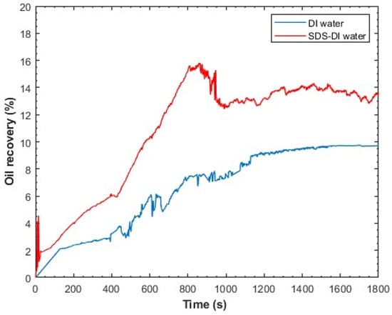 Oil recovery during DI water flooding and SDS–DI water flooding.
