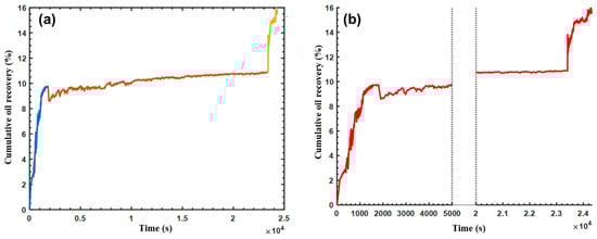 (a) Cumulative oil recovery during the DI water flooding with the intermediate oil swelling at 5 psig. First flooding (blue line), CO2-based oil swelling (orange line), second flooding (yellow line). (b) Trimmed time axis for better representation of the plot.