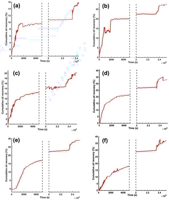 Cumulative oil recovery in flooding experiments. (a) DI water floodings with intermediate oil swelling at 5 psig. (b) SDS–DI water floodings with intermediate oil swelling at 5 psig. (c) DI water floodings with intermediate oil swelling at 10 psig. (d) SDS–DI water floodings with intermediate oil swelling at 10 psig. (e) DI water floodings with intermediate oil swelling at 15 psig. (f) SDS–DI water floodings with intermediate oil swelling at 15 psig.