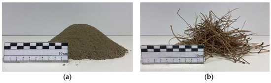 The reinforcement solution analysed in this study uses natural pine needles collected from stone pines, Pinus pinea, in the same region, Figure 1. With 52–60% cellulose, 13–15% lignin, 20% hemicellulose, and 5% of other extractives, this biodegradable material has a maximum tensile strength ranging between 35.8 and 36.94 MPa [22]. The physical characteristics of the natural reinforcement were analysed from a sample of 15 g in mass, concluding that the length of the pine needles varied from 60 to 180 mm, giving an average value of 117 mm; the average width was 0.87 mm, with values ranging between 0.62 and 1.11 mm. The ratio length/width (considering average values) was 134. The fibres were used in their natural state, after cleaning and an air-drying process. Damaged fibres were discarded.