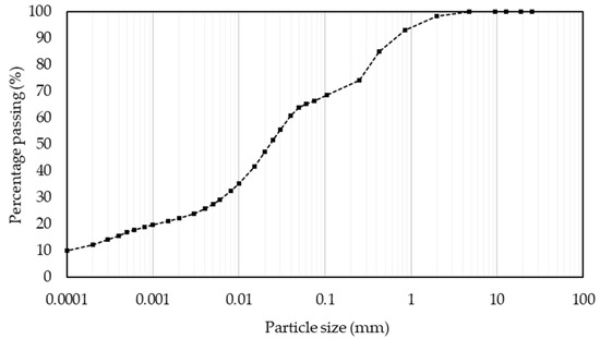 The soil originates from the Aveiro Lagoon, Portugal, and was collected from a salt pan wall. Considering the Unified Soil Classification System [18], the soil is considered a ML, sandy silt. This soil is mostly formed of fine particles (>0.074 mm), 65.7% precisely. Given the high percentage of fine particles, the Atterberg limits [19] of the soil were evaluated; its liquid limit, wL, is 35%, and its plastic limit, wP, is 25%, resulting in a plasticity index, IP, of 10%. Considering the conditions of modified Proctor tests (method C) [20], the optimum water content, wopt, and the corresponding maximum dry density, γdmax, were 13.9% and 18.09 kN.m−3, respectively. The grain size distribution of the soil is illustrated in Figure 2, determined according to [21].