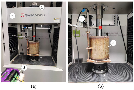 After the specimen preparation, the mould was placed into the loading frame (Figure 3a, (2)) with 100 kN capacity. Throughout the test, an axial displacement was applied at a constant rate. The load cell (Figure 3a, (1)), 5 kN capacity, measures the force applied to the specimen, and the displacement linear variable differential transformer, LVDT with 25 mm stroke, (Figure 3b (4)), reads the displacement of the plunger. The data logger (Figure 3a, (3)) registers both variables in real time.