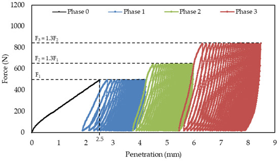 At the end of phase 1, another phase of repeated loading was started. This new loading stage (phase 2) corresponded to applying a maximum load (F2 in Figure 4) 30% larger than that of phase 1 (F1 in Figure 4), following the procedure described by [2]. Similarly, a third phase of repeated loading was applied, herein designated as phase 3 (with a maximum applied force, F3 in Figure 4), as in [2]. These phases (2 and 3) aimed at assessing whether the specimen acquires a different elastic response when subjected to different load stages. The same number of cycles was considered for each repeated load stage (35 cycles, with a total of 105 cycles).