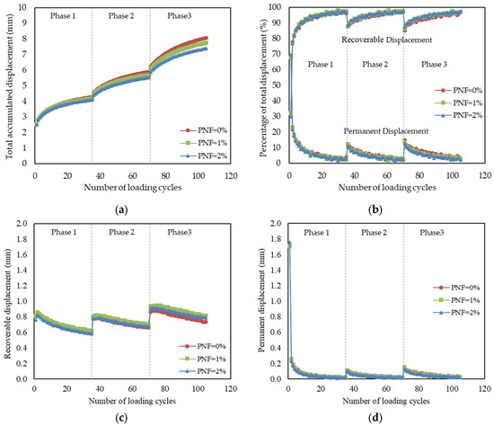 Total, recoverable, and permanent displacement per cycle for different PNF (average of three specimens): (a) total accumulated displacement; (b) percentage of permanent and recoverable displacement; (c) recoverable displacement; (d) permanent displacement.
