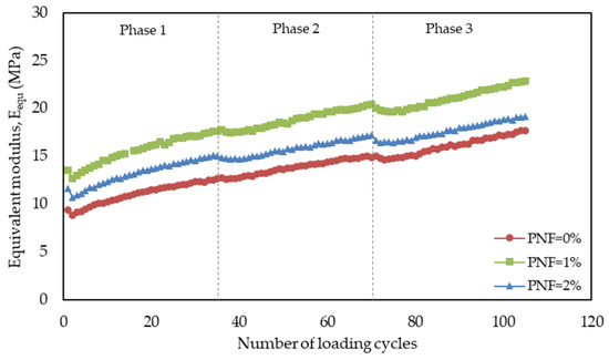 To assess the soil response to repeated loading, an equivalent elastic modulus (Eequ) was estimated (Equation (2)). This parameter was calculated for all loading cycles of phases 0 to 3, although the most representative value refers to the last cycle of each phase (Eequ for the resilient response of the material). Figure 7 shows the evolution of Eequ with the number of loading cycles for the different conditions studied (PNF of 0%, 1%, and 2%).