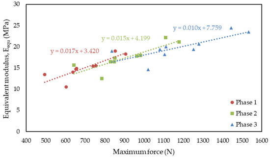 Haghighi et al. [2] mentioned that the slope of the equivalent modulus–plunger stress relation can be used as an indication to investigate the failure of the material. According to the authors, if the slope decreases, the soil is approaching its maximum strength. The relation between Eequ and maximum force for each of the phases 1 to 3 is presented and analysed in Figure 8 (for all PNF). The slope of the trendline for each phase is reduced: 0.017 for phase 1, 0.015 for phase 2, and 0.010 for phase 3. This reduction indicates that the soil matrix is reaching its maximum strength, regardless of the fibre reinforcement.