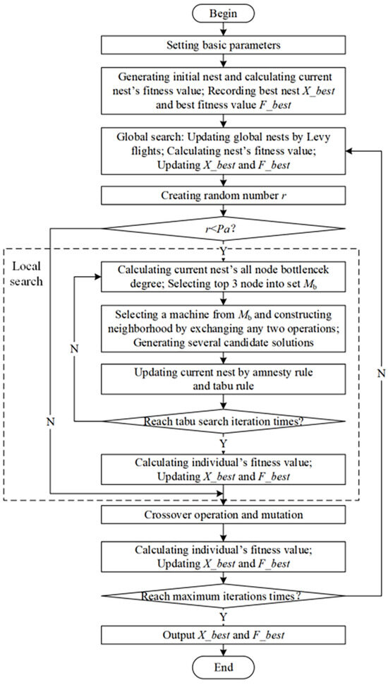 The cuckoo search algorithm is a meta-heuristic algorithm proposed by Yang and Deb [32]. It has the advantage of powerful searching ability and can effectively balance global and local searches. It is a widely used and successful algorithm in various engineering and management problems. It is applied to solve optimization problems by simulating the parasitic brooding behavior and flight characteristics of cuckoos. On one hand, the CS uses levy flight to find nests for breeding the next generation. On the other hand, the location of the nest is updated according to the probability of the eggs being discovered by the host bird. It offers two new solutions generated through global Levy flight random walk and local random walk. Levy flight obeys Levy probability distribution, with the search path consisting of frequent short jumps and occasional long jumps. This method can provide the CS algorithm with a larger search space. For large-scale optimization problems, the global search based on Levy flight is beneficial for exploring the algorithm over a wide range. However, the original local search strategy overlooks certain local optimization information, which leads to an algorithm prone to vibration in late running. Therefore, the local search strategy of the cuckoo search algorithm was replaced by adopting a tabu search. In addition, a construction strategy for the tabu search neighborhood structure under the search guidance of bottleneck degree was implemented to improve the searching ability of the algorithm. Neighborhoods were constructed by identifying machines with a high bottleneck degree and adjusting their schedules within the inter-cell manufacturing system. Bottleneck degree is used to guide the algorithm to optimize the search.