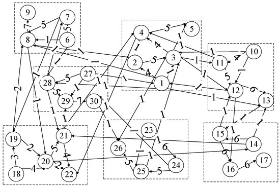 As shown in Figure 4, there are seven cells, 30 machines, and 50 parts in the complex network model for a schedule. Each dashed box represents a separate manufacturing cell, the number on the node represents which machine it is, the directed edge represents the direction and flow of parts between machines, and the number on the directed edge represents the numbers of the parts flowing between two machines. For example, the number 4 on the directed line between machine 1 and machine 2 indicates that four parts flow to machine 2 for processing after machine 1 finishes processing.