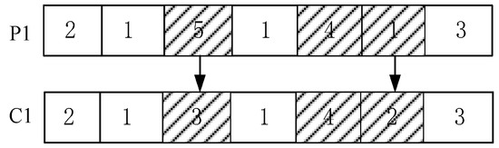 As exceptional parts have flexible routes, crossover and mutation are designed to ensure population diversity. For the machine-encoding segment, the multi-point preservative crossover (MPX) is applied. As shown in Figure 6, P1 and P2 represent two machine-encoding segments, and the shaded sections represent the coding bits of machines that processed exceptional operations. a set S composed of 0s and 1s is randomly generated, the length of the set equal to the number of exceptional parts, in which 0 indicates no action and 1 indicates crossover accepted. In encoding, exceptional parts and their machines are known, so the positions on the set correspond to the coding bits of the machine. Moreover, based on the position of 1 in the set S, determining the coding bits of the exceptional parts machines in the parents 1 and 2, and exchanging machines while other machines remain unchanged, the child encodings 1 and 2 are generated. The crossover is applied to exceptional parts, and alternative machines are known, so it will not change the constraints of operations of a given part, and the child encodings are all feasible solutions.