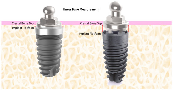 - Rana, V.; Dhakne, V.M.; Jadhawar, S.; Kadam, I.; Mishra, K.; Patil, P. Bone Level Measurements Around Platform Switched and Platform Matched Implants: A Comparative Study. Niger. J. Surg. 2019, 25, 9–13. [Google Scholar] [CrossRef]