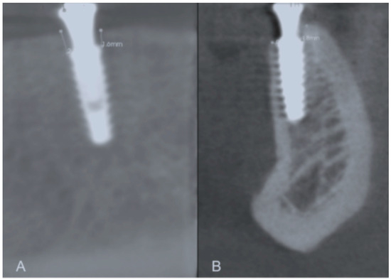 Representative images of the buccal, mesial, lingual, and distal bone level measurements. (A) Mesial and distal bone level measurement; (B) Buccal and lingual bone level measurement.
