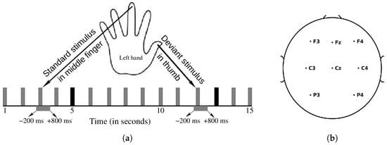 Mechanical vibrations were delivered via vibration motors placed on the fingers. ‘Frequent’ (or ‘standard’) and ‘infrequent’ (or ‘deviant’) stimulations were delivered to the ring finger and thumb of the left hand, respectively. Frequent and infrequent stimulation occurred at a ratio of and , respectively, with pseudo-randomized occurrence. Figure 1a shows a schematic diagram of the protocol for stimulus delivery. Three successive runs of 500 stimuli were delivered with 1 s of interstimulus interval. During the experiment, the participants sat comfortably in a chair in a quiet room and were asked to read a text displayed on a screen while stimuli were delivered to their fingers. The vibration motors were attached to the nail side of the finger (Figure 1a) because of the more direct transmission of vibration. A microcontroller provided an interface between the vibration motors and a computer. A Viewablewritten software controlled the delivery of vibrations, i.e., the sequence of stimulation. All subjects received the same vibration amplitude and frequency (1 G at 200 Hz).