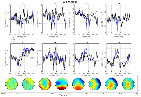 Top and middle panels: median traces of event-related potentials and their differences across the patients for different channels. Traces for standard stimuli are represented with a gray line, for deviant stimuli with a blue line, and for differences with a black line. STD—standard; DEV—deviant; DIFF—difference. Lower panel: spatial topography of activation patterns (difference: deviant minus standard) on different time windows.
