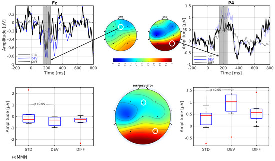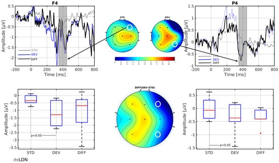 - In line with our assumption, the observed mismatch-related ERP components from frontal and parietal channels were statistically significant at two predefined latency ranges: and channels at 150–250 ms and and channels at 350–450 ms after the stimulus onset. The observed response in the time range of 150–250 ms is considered as sMMN, and the response in the time range of 350–450 ms is considered as LDN. In terms of time window and channel location, these findings are qualitatively in good agreement with the studies involving healthy adults [21,25].