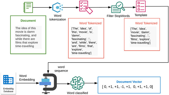 After the training set is built, each word w will have a polarity score along with its embedding vector. Then, these tuples are fed into a binary classifier following a standard training procedure. Once the classifier is trained, new words, along with an available embedding, can be classified as positive or negative. The example shown in Figure 2 depicts the text processing tasks performed to generate a polarity vector from text content. This vector contains has values and for words whose polarity is predicted as negative and positive by the classifier respectively. A 0 value is used for words whose embedding is not available.