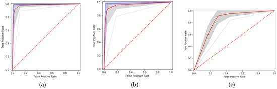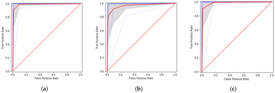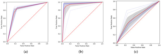 ROC curves for 10 runs of Senti-Sequence over each dataset. Curves in blue denote the maximum performance, red denotes the average, and dotted blue denotes the minimum performance. (a) IMDB dataset. (b) Twitter dataset. (c) Books generic dataset.