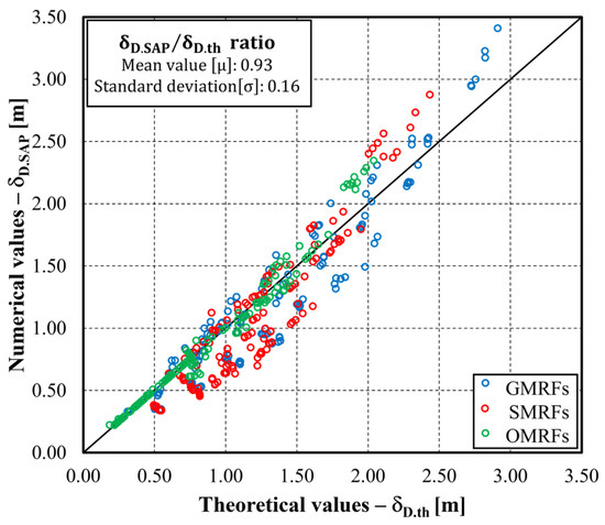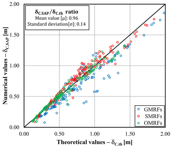 The accuracy of the proposed trilinear model is depicted in Figure 5 and Figure 6. In particular, a comparison between the results of the pushover analysis and those derived by the simplified approach is provided with reference to the prediction of displacements and . The x-axis denotes the theoretical values obtained by Equations (8) and (9), while the y-axis represents the values derived by SAP 2000.