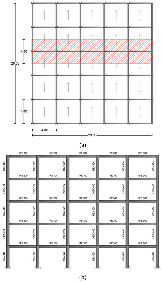 The flooring systems consist of concrete slabs on a corrugated sheet of steel with a thickness of 10 mm. The cross-sections of the outer and inner beams are HEA160 and HEA300, respectively, and all columns are HEA200 (Figure 9b).