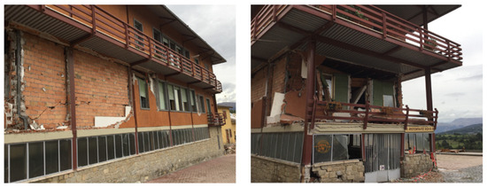 The building, located in Amatrice, Italy, was built some decades ago, before the introduction of modern seismic design standards. The building was damaged during the Central Italy earthquakes (24 August 2016 and 30 October 2016). The building lies on type B soil in the topographic category T1 [18]. The building plan is trapezoidal, measuring 6.60 m in the smaller front and 8.50 m in the larger one. It is approximately 22.5 m long. The inter-storey height is variable (about 3.60 m), as reported in Figure 10.