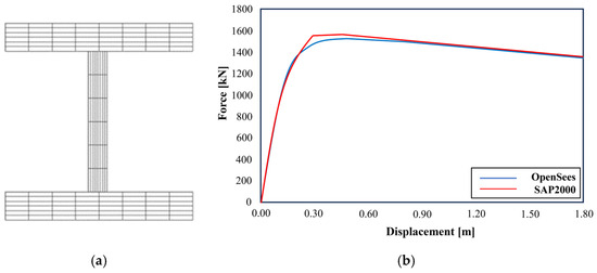 Figure 12b depicts the comparison between the static pushover curves obtained from SAP2000 and OpenSees for Case Study 1. Notably, the SAP2000 model employs lumped plasticity, utilizing P-Hinge properties. In contrast, Opensees replicates the structure’s behaviour using distributed plasticity without incorporating any material hardening.