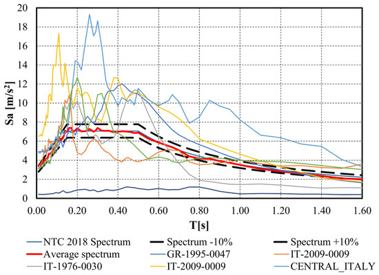 The structures, previously described, have been subjected to seven accelerograms, which have been opportunely chosen to assure that their average value was compatible with the design response spectra provided by the Italian seismic code [40] for soil type B and a PGA equal to 0.261 g.