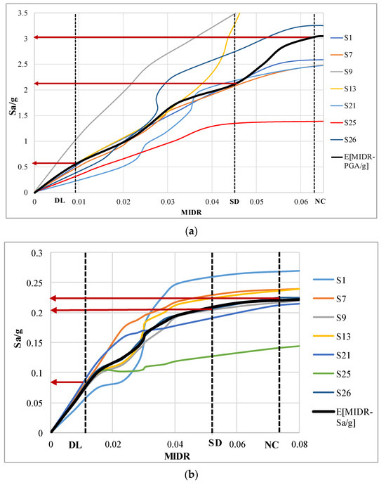 Sa/g value evaluated for each MIDR limit provided by EN1998-1-3 [31]: Case study 1 (a); Case study 2 (b).