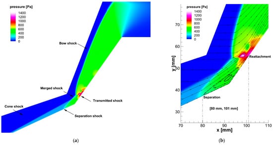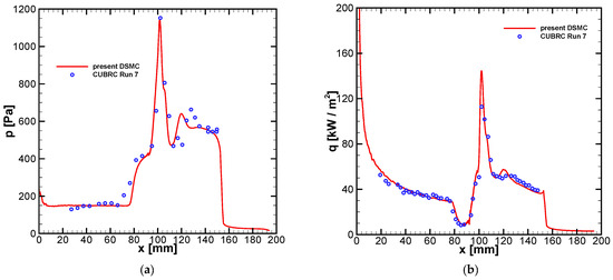 An axisymmetric DSMC simulation was performed, and the results of the flow patterns and quantities along the cone surface are shown in Figure 1 and Figure 2. The positions of the separation and reattachment points coincide with the results reported by other researchers [31]. The DSMC predictions of the wall pressure and wall heat flux distributions also agree well with the experimental data [29], as shown in Figure 2.
