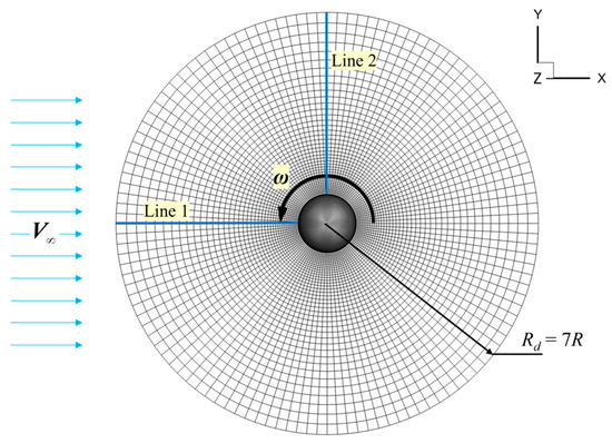 The coordinate system, the computational domain, and the grid are demonstrated in Figure 5. The x-axis is aligned with the freestream velocity V∞, and the direction of the z-axis is the same as the angular velocity vector ω. The origin of the coordinates is placed at the center of the sphere. Note that the flow is symmetric about the xy plane, and therefore only half of the space (z > 0) needs to be considered. The computational domain is a hemisphere with a radius Rd = 7R. The body-fitted grid contains 108,000 hexahedral cells, and the minimum cell size is about 4 mm.
